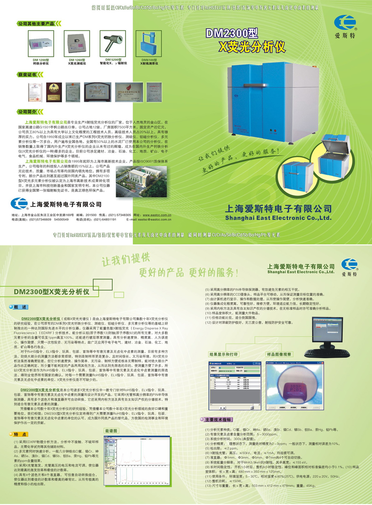 專門針對RoHS、ELV、玩具、包裝、首飾等中有害元素及無鹵化中鹵素的測量。能同時測量Cl、Cr、As、Se、Br、Cd、Sb、Ba、Hg、Pb等元素。儀器采用了能量色散X射線熒光(Energy Disperse X Ray Fluorescence)(EDXRF)分析技術,能分析從鋁(原子序數13)到鈾(原子序數92)的所有元素,對大多數元素分析的含量可低至1ppm高至100%,還能進行鍍層厚度測量。