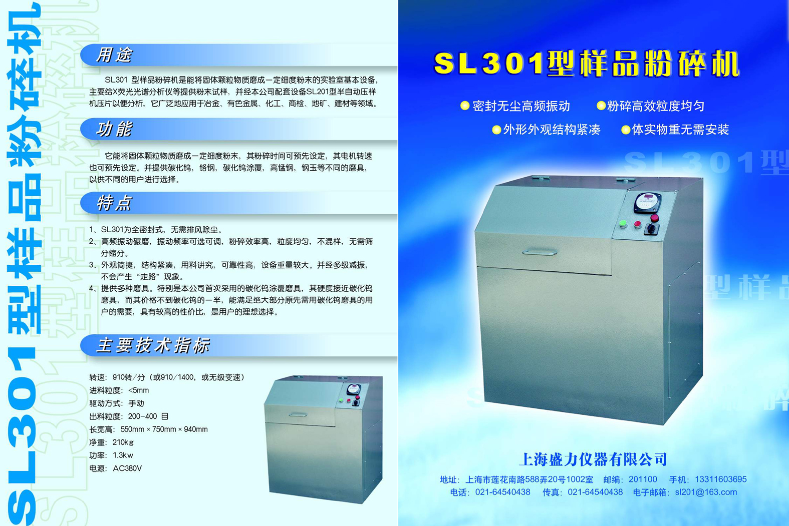 SL301型樣品粉碎機(jī)是能將固體顆粒物質(zhì)磨成一定細(xì)度粉末的實(shí)驗(yàn)室基本設(shè)備,主要給X熒光光譜分析儀等提供粉末試樣,并經(jīng)本公司配套設(shè)備SL201型半自動(dòng)壓樣機(jī)壓片以便分析,它廣泛地應(yīng)用于冶金﹑有色金屬﹑化工﹑商檢﹑地礦﹑建材等領(lǐng)域。
