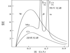 X射線管(X-ray tube)產生X射線的方法是加熱陰極(例如燈絲),使電子從熱陰極材料發出,并通過施加的高壓向陽極加速,用加速后的電子撞擊陽極材料(金屬靶),撞擊過程中,電子突然減速,其損失的動能(其中的1-2%)會以光子形式放出,形成X射線光譜的連續部分,稱之為韌制輻射。通過加大加速電壓,電子攜帶的能量增大,則有可能將金屬靶原子的內層電子撞出。于是內層形成空穴,外層電子躍遷回內層填補空穴,同時放出波長在0.1納米左右的光子。由于外層電子躍遷放出的能量是量子化的,所以放出的光子的波長也集中在某些部分,形成了X射線光譜中的特征線,此稱為特征輻射。