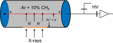 這種探測器的結構大多采用圓柱形,中心是陽極細絲,圓柱筒外殼是陰極,筒內充滿0.5至2個大氣壓的隋性氣體,并加有5%至10%左右的淬滅氣體(一般為CH4、乙醇或Cl2)。圓筒的側壁或一端設有入射X射線的“窗”,所用窗口材料通常為鈹或聚合物。入射粒子與筒內氣體原子碰撞使原子電離,產生電子和正離子。在電場作用下,電子向中心陽極絲運動,正離子以比電子慢得多的速度向陰極漂移。電子在陽極絲附近受強電場作用加速獲得能量可使原子再電離。從陽極絲引出的輸出脈沖幅度較大,且與初始電離成正比。